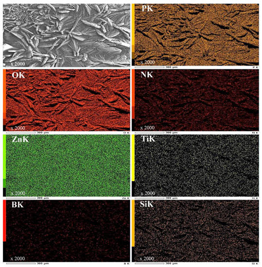 Compositional analysis of the phosphate-silane layer on the PBT-0.3 specimen surface was characterized by a 20.0 kV energy-dispersive spectrometer (EDS) mapping analysis. Figure 4 depicts the phosphate-silane-coated sample’s elemental distribution and surface shape. The EDS mapping shows that the O and P elements represent the phosphate salts. Large crystals and spaces inside the phosphate sample reflect the phosphate crystals with varying appearances because P and O elements exist consistently across the entire substrate area. This results in both massive crystals and voids inside the phosphate sample. Fe elements were detected in the EDS map, originating from the P-Fe-Zn crystals, the steel substrate, or the phosphophylite Zn2Fe(PO4)2·4H2O. The electron beam may penetrate the phosphate coating and reveal a greater concentration of Fe elements because of the coating’s permeability. The phosphate crystals in the phosphating solution were shown to have a higher concentration of Zn elements and Zn2+ ions than at the gaps when mapped using EDS. Phosphate-silane coatings were also dense because elemental mappings for B, Si, N, and Ti were concentrated there. Phosphate-silane crystals, as observed in FE-SEM in Figure 3d, may be co-precipitated by the PDA@BN-TiO2.