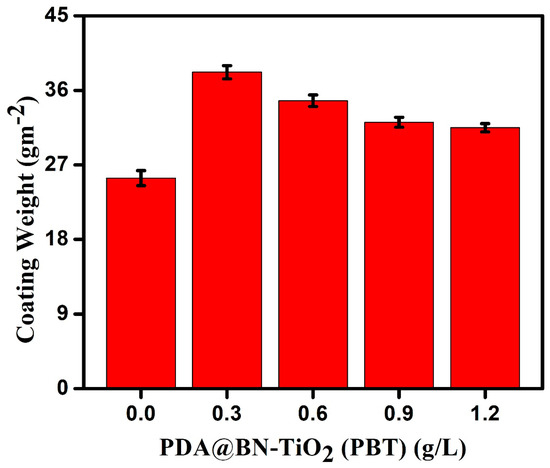 Steel specimens were submerged in a phosphating bath with different concentrations of PDA@BN-TiO2 (0.3 g/L to 1.2 g/L) for 20 min at 40 °C, and the integrity and thickness of the phosphate-silane coatings were assessed by the mass per unit area (MPA). The MPA can be measured by chemically removing the phosphate coatings and calculating the weight loss. It was observed that the MPA was significantly improved by adding PDA@BN/TiO2 nanohybrids into the zinc phosphating bath, up to 38.2 g/m2, as shown in Figure 5. The MPA of PBT-0 coatings was 25.4 g/m2. In contrast, the values of PBT-0.9 and PBT-1.2 decreased to 32.14 g/m2 and 31.49 g/m2 respectively. This observation resulted in the rapid formation of phosphate crystallization due to the PDA@BN-TiO2 nanohybrids.