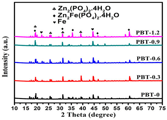 The phase composition of PBT-coated steel specimens is characterized by XRD analysis (Figure 6). It is evident from the XRD pattern that the steel specimen has developed Zn3(PO4)2·4H2O (hopeite, JCPD file #37- 0465) and Zn2Fe(PO4)2·4H2O (phosphophylite, JCPD file #29-1427). The crystal plane (002) of Zn3(PO4)2·4H2O exhibits a peak at 19.4°. However, incorporating polydopamine boron nitride-titanium dioxide slightly enhanced the intensities of Zn3(PO4)2·4H2O. The addition of polydopamine-modified boron nitride-titanium dioxide (PBT) did not alter the phosphate crystal structure of the coatings, as seen by the XRD pattern, which reveals no change in peak position. Furthermore, the peak intensity of Zn3(PO4)2·4H2O increased with an increase in PBT content, signifying an acceleration of the formation of Zn3(PO4)2·4H2O, enhancing the preferential growth of the phosphate crystals without changing the coating’s phase composition. Additionally, the progress rate of hopeite was higher than phosphophyllite when in a PBT-containing phosphating bath. The distinctive peaks of BNs were identified at 26.5, 41.5, and 50.1°, and the characteristic peaks of TiO2 were observed at 25.31°, 38.01°, and 48.02°, respectively, in the PDA@BN/TiO2-incorporated samples. These findings provide proof of the presence of PDA@BN/TiO2 in the resulting coating.