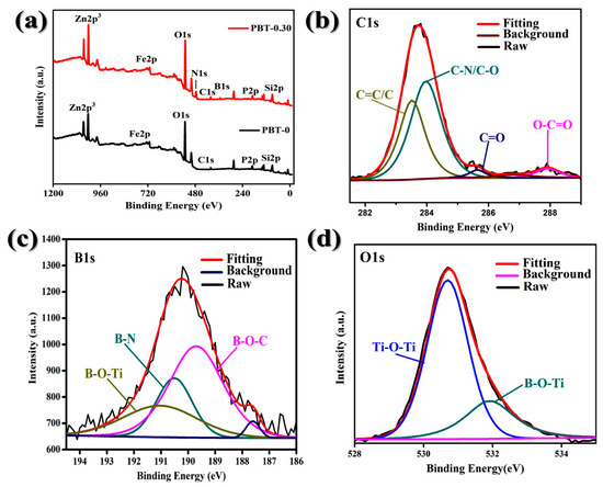 (a) XPS survey scan of PBT Phosphate coating. (b) C1s, (c) B1s, (d) O1s.