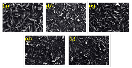 An investigation of the microstructural changes during the phosphating process was conducted using a scanning electron microscope (SEM), which allowed for assessing the phosphating mechanism and discussing the observed changes and the implications for the material. SEM images in Figure 8a–e demonstrate the observed features of PBT-0, PBT-0.3, PBT-0.6, PBT-0.9, and PBT-1.2 during the phosphating procedure. Figure 8 depicts the progressive formation of phosphate-silane crystals, and incorporating PDA@BN-TiO2 accelerates the growth rate. PBT-0.3 sample crystals exhibited the highest rate of development proportionally. PBT-0 does not form crystals, even when the phosphating time increases, resulting in a thin layer of phosphate particles covering the base material. Incorporating PDA@BN-TiO2 into the phosphating bath could promote crystallization and induce the precipitation of phosphate crystals under short treatment times of 20 min, as shown in Figure 8. Figure 8b demonstrates the PBT-0.3 sample after phosphating, with the surface entirely covered with small phosphate crystals.