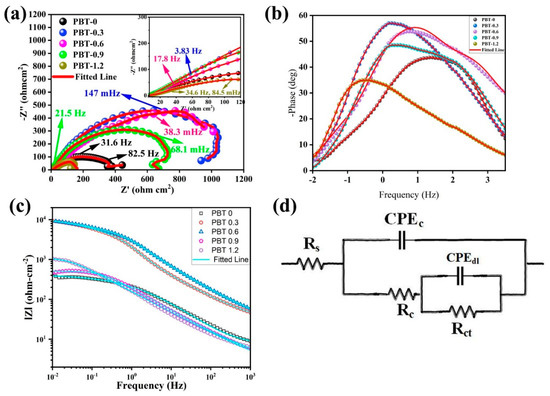 Analysis of Electrochemical Impedance Spectroscopy of Phosphate-Silane Coated Surfaces with Varying PBT Concentrations (a) Nyquist plot, (b) Phase angle plots, (c) Bode plots, (d) equivalent circuit diagram.