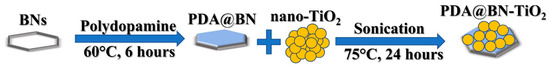 The preparation procedure of Polydopamine modified Boron Nitride/Titanium dioxide (PDA@BN/TiO2).
