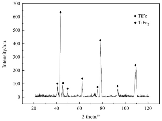 The XRD measurement of the weld bead was conducted for the phase determination, and the result is shown in Figure 4. Obviously, the weld bead was mainly composed of TiFe and TiFe2, which were brittle intermetallics and easily fractured due to the tensile stress during the cooling stage [15].
