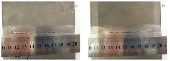 Firstly, the laser welding of TA2 pure titanium and Q235 steel was performed without adding intermediate layer metal. The process parameters were 1200 W laser power, 1200 mm∙min−1 welding speed, 0 mm defocus distance and 15 L∙min−1 argon flow. The laser beam irradiated the butt joint without biasing. However, the longitudinal through-wall crack appeared immediately after the welding, as shown in Figure 3.