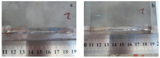 Macrographs of the weld joint with the interlayer but no biasing: (a) top side; (b) back side.