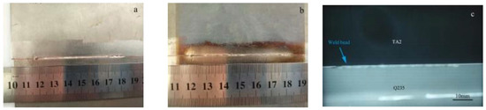 Furthermore, laser welding with 0.5 mm thick copper interlayer and biasing of 0.2 mm to titanium was tried. The forming result is displayed in Figure 7. The specific heat capacities of titanium, steel and copper are similar, but their thermal conductivities are very different. The thermal conductivity of TA2 is about 14.63 W/m∙K, and those of Q235 and copper are about 83.74 W/m∙K and 397.51 W/m∙K, respectively. In other words, the welding heat diffused far away at the Q235 side, but it was suppressed at the TA2 side, which caused a localized melting of TA2, while the Q235 was unmelted [17,18,19].