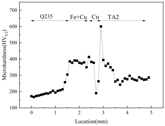 The cross-sectional microhardness distribution of the joint is shown in Figure 10. The microhardness shows a complex fluctuation. The microhardness of the Q235 was basically the lowest, averaging about 171.71 HV, while the TA2 had a higher hardness that reached approximately 278.52 HV. In the transition zone of the Q235 to weld bead, the microhardness gradually increased. The microhardness within the weld bead was essentially the same as approximately 381.63 HV. However, the Cu layer that was not involved in the weld pool mixing had a lower microhardness of about 190.72 HV. At the bonding site of the TA2 and Cu, the microhardness rose significantly to the maximum value of 600.49 HV. With the transition to the TA2 base metal, the microhardness gradually decreased to the level of the TA2.