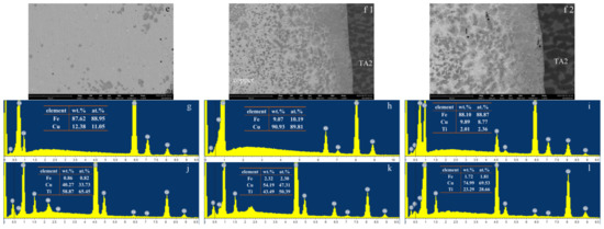 Figure 11(b1) shows the bonding area of the Q235 and weld bead. A clear fusion line can be found separating the Q235 from the weld bead. The further magnified observation of this region is shown in Figure 11(b2). The grains in the weld bead grew attached to the Q235 boundary, showing a typical epitaxial solidification. These grains had obvious directionality towards the weld bead and exhibited a typical columnar dendrite morphology. The morphology of the weld center is shown in Figure 11(c1), consisting of a large number of dendritic crystals and a few intergranular phases. The magnification of this region is shown in Figure 11(c2). The dendritic crystals were dark gray, and the intergranular phases were light gray; they were labeled as g and h, respectively. The EDS results showed that they were Fe phases and Cu phases, respectively, as shown in Figure 11g,h. The bonding area of the weld bead and copper layer is shown in Figure 11d. There was an obvious boundary between them, and the irregularly shaped dark gray phases were sporadically distributed in the copper layer, as shown in position i. Its EDS result is shown in Figure 11i; the phases were mainly Fe ones. In the copper layer center, as shown in Figure 11e, a small number of Fe phases dispersed on the Cu matrix. Figure 11(f1) shows the bonding area of the copper layer and TA2. The interface between them was flat, and a layer of intermetallic compounds was generated adjacent to TA2, reaching a thickness of around 100 μm. When moving away from TA2, the number of compounds gradually decreases and soon transitioned to the copper layer. Further magnified observation of the compound layer revealed three main forms of compounds, as shown in Figure 11(f2). The dark gray compounds labeled as j appeared adjacent to TA2, whose dimensions were approximately 10 μm in length and 5 μm in width. The EDS result in Figure 11j showed that its composition was close to Ti2Cu. The slightly distant light gray compounds, marked as k, had tdendritic morphology up to 100 μm in length, and their composition was close to TiCu, as shown in Figure 11k. Another off-white phase was wrapped around TiCu phases, which showed a typical peritectic or peritectoid pattern. EDS results indicated that the compositions were close to TiCu2, as shown in Figure 11l.
