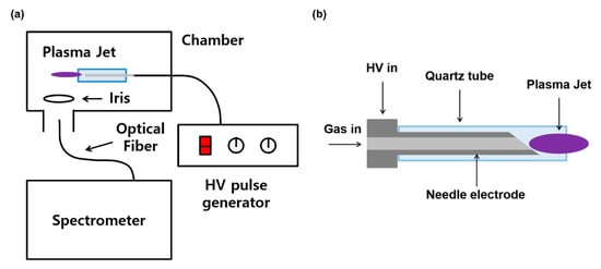 Figure 1a shows the schematic design of experimental settings. A needle-shaped plasma jet (Figure 1b) is placed in a grounded chamber. The source consists of a 4 cm-long stainless-steel needle and a 4.3 cm-long quartz tube. The inner diameter of the quartz tube is 2 mm, and the outer diameter is 3 mm. Argon gas flows through the needle, and the high-voltage (HV) needle generates a jet plume. A home-made HV nanosecond pulse generator (CNSL, KAIST) was used for the plasma jet operation. It had a peak voltage of 6 kV, two different pulse widths of half-maximums 350 and 700 ns, with a repetition rate of 20 kHz, which gave the same average powers of 1 W with different pulse duties by current control. An OH 309 nm band (Figure 2) was observed by optical emission spectroscopy using a monochromator (DONGWOO OPTRON, Gwangju, Republic of Korea) and an ICCD camera (iStar, Andor, Belfast, Ireland). As the flume length is changed by the input voltage, power and gas flow, iris is used to normalize the emission intensity.