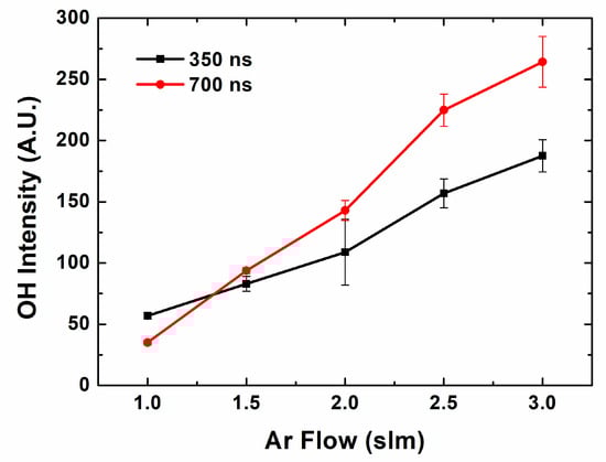 In the atmospheric pressure plasma jet, Ar gas is fed and mixed with the air. Hydroxyl radicals are generated from hydrogen, oxygen and water in the air. Figure 3 shows the OH 309 nm band intensity depending on the pulse length. In this case, the pulse width is proportional to the pulse duty, which means it is inversely proportional to the instant power. The OH band intensity can be used to monitor the OH radical density qualitatively [29]. Basically, OH radical generation increases with the gas flow. As Ar gas works as an electron source, plasma discharge efficiency and the electron density increases, which contribute to OH radical generation. Moreover, in this gas flow range, the jet flume expands with the gas flow, which gives a larger discharge volume, and this contributes to OH radical generation. Comparing two pulse cases, in nanosecond pulse range, a longer pulse generally generates more OH radicals. As the gradient of OH radical intensity on Ar gas flow in longer pulse is higher than that of shorter pulse, the difference becomes bigger in higher gas flow. It means that a longer pulse is advantageous for OH radical generation in relatively lower H2O conditions. These results are unique characteristics of nanosecond pulsed operation, whereas microsecond pulse show little pulse width effect on the OH radical production [27].