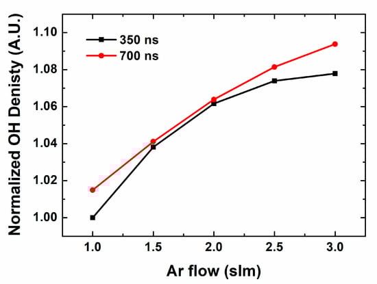 To supplement the experimental results, we have adopted a chemical simulation. OH radical production depending on pulse width is studied in the similar conditions with experimental environment. Figure 4 shows OH radical productions on the Ar gas flow in different pulse widths, 350 and 700 ns. Overall, OH radical productions show similar behaviors to experimental case. It increases with gas flow, and longer pulse shows higher value and gradient. The concrete value of each case shows some difference, with stronger dependence on gas flow in experimental case. In real situation, the size of jet flume is changed by the gas flow, and the fluidal characteristics also affects the shape and emission intensity of the jet flume. Nevertheless, it cannot turn over the trend and correlation of the pulse characteristics, the analysis is still valid.