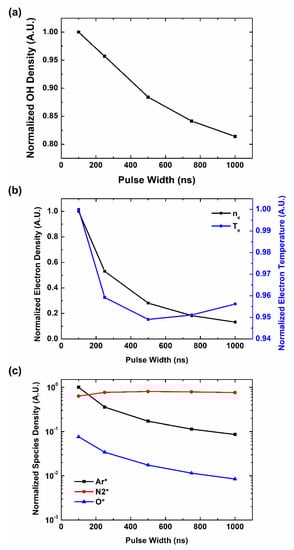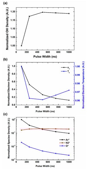 Humidity is one of the important factors in OH radical production. It is reported that humidity has a significant effect on OH radical production [44,50]. As the source of OH radical in atmospheric pressure is H2O, humidity in air can change the main reaction path and the tendency of OH radical production by pulse characteristics. In our works above, the ratio of H2O is fixed at 0.2% in the assumption of dry condition. In the case of plasma jet treatment on bio-surfaces, many conditions can be considered to be humid. Therefore, we also study OH radical production by pulse characteristics, using a chemical simulation in a humid condition with H2O ratio 2% as shown in Figure 6a. In humid case, OH radical density decreases with pulse width, which is opposite behavior comparing to dry case. Figure 6b shows the behaviors of electron parameters. Both electron density and temperature decrease with the pulse width, which follows the trend of OH radicals. However, behaviors of other reactive species do not show correlation with OH radical productions. Therefore, in humid cases we can find that reactions like no. 61, which accompany electrons, are the main source of OH radical production.