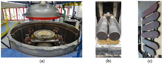 The preparation of experimental material: (a) vacuum induction furnace; (b) cast ingots prepared for homogenisation annealing; (c) final form of the sheets.