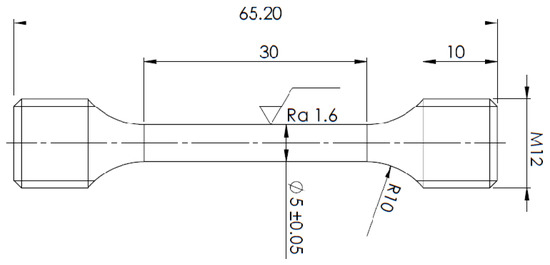 Tensile testing was carried out according to EN ISO 6892-1 [21]. There were three specimens processed with the appropriate heat treatment that were evaluated each time. The dimensions of the samples can be seen in Figure 2. The measurements were tested on an electromechanical testing machine—a Zwick/Roell 250 kN laser extensometer.