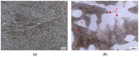 Samples were cut from the base of the ingots for metallographic analysis. As a result of significant segregations during solidification, the structure of the heat 7Al (0.7% C and 7% Al) presented a characteristic dendritic arrangement in the as-cast state. This can be observed in Figure 3a, where the bright spots corresponding to the ferrite phase can mainly be seen; the latter forms the major and minor axes of the dendrites in the structure. The brown areas correspond to the eutectoid mixture, pearlite, which fills the interdendritic spaces. Figure 3b shows the morphology of the eutectoid mixture (P-pearlite). Carbides are excluded, here, in both lamellar and globular forms. The kappa phase (κ) is excluded along the boundaries of the original austenitic grains. These are allotriomorphic particles formed at grain boundaries. These particles nucleate, mainly, at the grain boundaries of the original austenite and grow further along these boundaries. However, the kappa phase also occurs in the structure, as plates nucleate at grain boundaries and grow inside the grains. In some cases, the kappa phase occurs independently inside the ferrite grains as idiomorphic crystals. The cooling kinetics or local chemical composition determines the distribution and morphology of the particles.