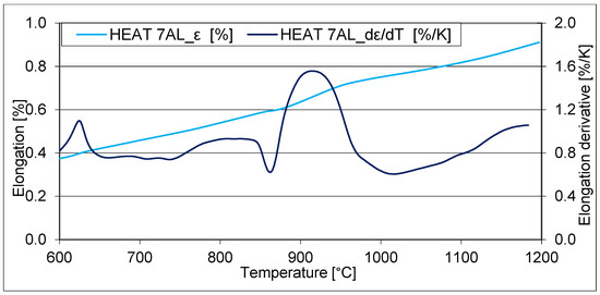 The dilatometric curve and its derivation—heating up at 3 °C/min. Heat 7Al (0.7% C and 7% Al).