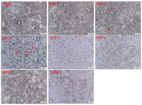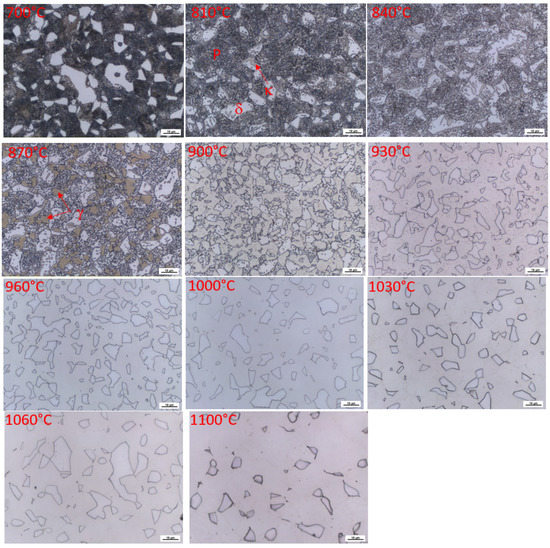 In the description of the structures, here, we are talking about the γ phase—austenite. Of course, after cooling, the figures show areas that transformed into martensite with retained austenite. At the same time, apparently, with the increasing temperature, there is further formation of austenite at the expense of the ferritic phase (compare the microstructures at 930 °C and 1100 °C).