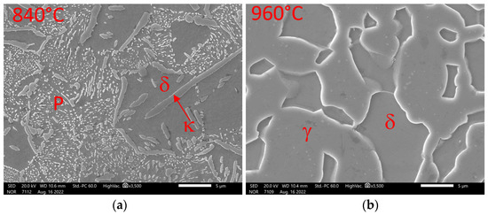 Figure 7 shows the SEM images of samples quenched from temperatures of 840 °C and 960 °C. It was confirmed that, at 840 °C, the structure consists of pearlite, delta ferrite, and kappa phase, occurring mainly at the boundaries of the original austenitic grains. The kappa phase naturally contains a higher Al content than ferrite. It is clear, from the analyses of the phases (Table 3) occurring at 960 °C, that there is no major redistribution of alloying elements between ferrite and austenite.