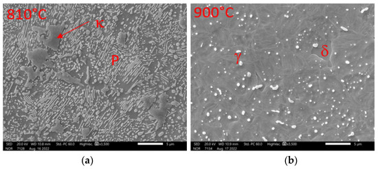 Figure 10 shows SEM images at 810 °C and 900 °C. The image on the right (810 °C) shows the formation of the first austenitic grains. At the same time, globular chromium carbides and lamellar pearlite are visible in the structure. There is a clear correspondence between the chemical composition of the austenite and the ferritic matrix (Table 4). At 900 °C, isolated grains of ferrite are present in the structure, with the austenitic phase dominating (transformed to martensite in the image). Part of the chromium carbide is dissolved. As already mentioned, the chemical composition does not differ significantly between the phases. The aluminium content, in this case, is slightly higher in the delta ferrite by about 1 wt%.