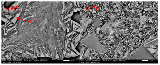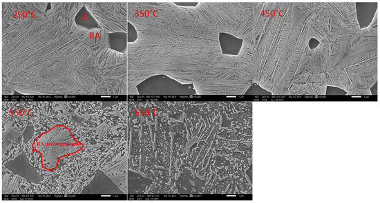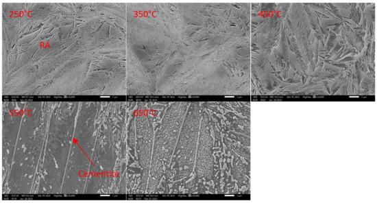 Consistent with the previous heat, we can say that it starts to form at temperatures below 200 °C, following the dilatometric indications (Figure 15). The morphology of the carbides is mainly plate-like. As the tempering temperature increases to 350 °C, the carbides do not coagulate, but they increase slightly in quantity. The coarsening of the carbides occurs only at 450 °C (Figure 16). The plate-like morphology is preserved. When the temperature increases above 550 °C, the transit carbides are already coarsened, and cementite particles are formed. The BED images show that the stability of austenite decreases significantly from tempering temperatures of about 500 °C.