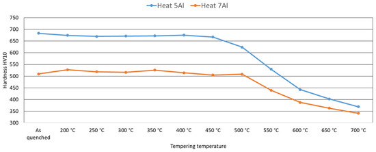 Heat 5Al has a lower resistance against tempering. The hardness drop occurs from 450 °C upwards. Above this temperature, retained austenite breaks down. The coarsening of the carbides’ formation of cementite also occurs.