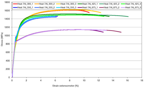 Tensile test results at tempering temperatures of 300 °C, 425 °C, 550 °C, and 675 °C. Heat 7Al.