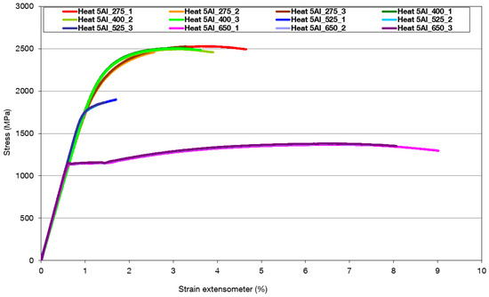 Tensile test results at tempering temperatures of 275 °C, 400 °C, 525 °C, and 650 °C. Heat 5Al.