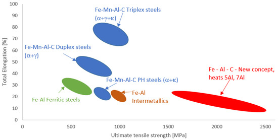 The ranges of tensile strength and total elongation of some of the low-density steels are shown in the so-called “banana diagram” in Figure 22 [22].