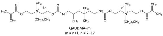 Our research group has been working on new di-QAMs and their copolymers. These monomers include a series of urethane-dimethacrylates with two quaternary ammonium groups (QAUDMA-m, m being related to the length of the N-alkyl substituent and corresponding to 8, 10, 12, 14, 16, and 18 carbon atoms) (Figure 1) [31]. QAUDMA-m monomers are similar in chemical structure to the so-called urethane dimethacrylate (UDMA) monomer due to the following structural elements: (i) the 1,6-diisocyanato-2,4,4-trimethylhexylene (TMDI) core, (ii) two arms attached to the core by carbamate linkages, and (iii) methacrylate group at the end of each arm. The presence of the QA group in each arm distinguishes QAUDMA-m from UDMA.