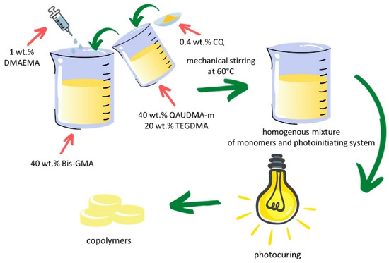 Methacrylate monomers with quaternary ammonium (QA) groups are suitable components that, when chemically incorporated into the structure of the organic matrix of dental composite restorative materials (DCRM), give them anti-microbiological activity [10,11,12]. This type of modification involves the free radical copolymerization of QA monomers with common dental dimethacrylates such as bisphenol A glycerolate dimethacrylate (Bis-GMA), urethane-dimethacrylate (UDMA), and triethylene glycol dimethacrylate (TEGDMA), which leads to the formation of polymer networks with high crosslink density [13,14].