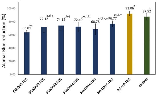 The cell viability determined for BG:QAm:TEGs was from 63.81 to 76.77%. Alamar Blue percent reduction values were statistically similar (p > 0.05), except for BG:QA8:TEG. The cell viability of the latter was lower (p ≤ 0.05) than that of BG:QA12:TEG and BG:QA18:TEG. Compared to the BG:UD:TEG, cell viability was reduced in all BG:QAm:TEGs (p ≤ 0.05).