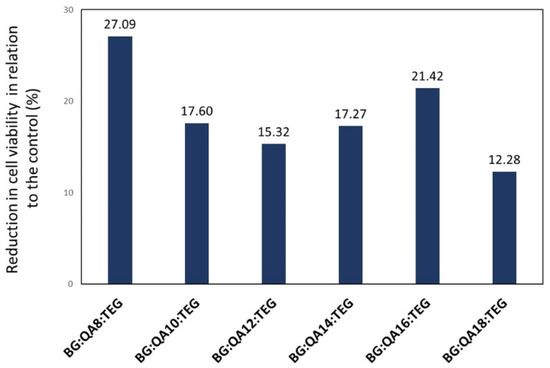 The viability of L929 mouse fibroblast cells in BG:QAm:TEGs was related to the control. The results of these calculations are shown in Figure 4. As can be seen, the reduction in cell viability observed for BG:QAm:TEGs ranged from 12.28 to 27.09%.