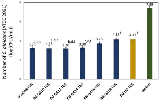 All BG:QAm:TEGs and BG:UD:TEG showed antifungal activity against C. albicans. The BG:QAm:TEGs with Cm lower than C16 showed similar and the highest antifungal activity. The number of fungus colonies found on their surfaces was 103 orders of magnitude greater. Further increase in the Cm resulted in a significant increase in the log(CFU/mL) values. The BG:QA18:TEG had the highest log(CFU/mL) value, which simultaneously was almost the same as that for BG:UD:TEG.