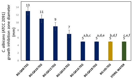 The fungal growth inhibition zones were only observed for BG:QAm:TEGs with Cm lower than C16. Their diameters ranged from 13 to 7 mm and decreased as the Cm increased. BG:QA16:TEG and BG:QA18:TEG showed no inhibition zone, similar (p > 0.05) to the BG:UD:TEG.