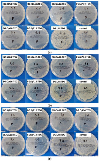 The qualitative assessment of the amount of microbial colonies observed on agar plates overlaid with BG:QAm:TEGs suspensions indicated that the concentration of 25 mg/mL is sufficient to kill all tested microbial strains (C. albicans—Figure 7a, S. aureus—Figure 7b, E. coli—Figure 7c). On the other hand, the concentration of 25 mg/mL of BG:UD:TEG reference copolymer can be recognized only as sufficient to inhibit the growth of tested bacteria strains. An inhibitory effect was not observed for the C. albicans strain, as the visual assessment of the colony number was similar for BG:UD:TEG and the control. The results for BG:UD:TEG reference sample showed that this typical dental copolymer had antibacterial activity but not antifungal activity.