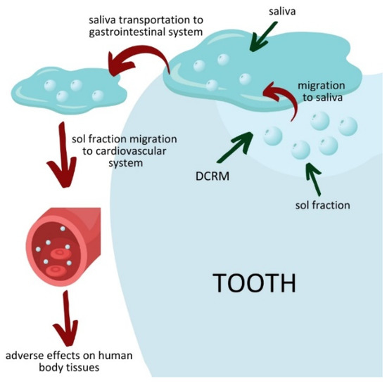 The cytotoxic effects of DCRM are closely related to sol fraction leaching [37,38,39]. The scale of this phenomenon depends on the combination of several factors, such as the matrix chemical structure, the degree of conversion [37,38], and oxygen inhibition on the DCRM surface [39]. The eluted substances can penetrate bodily tissues [38]. When they are cytotoxic, they cause inflammation, inhibition of cell division, or even necrosis (Figure 8) [40,41,42,43,44,45]. Therefore, the leachable fraction of dental material is standardized to 7.5 µg/mm3 [35].