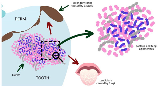 The biofilm formed on the tooth and dental filling surfaces consists of agglomerates of bacteria and fungi [48,49]. The acidic products of the bacterial metabolism cause enamel acidolysis and further secondary caries formation [50]. On the other hand, fungi cause candidiasis, considered the primary fungal infection of the oral cavity (Figure 9) [51]. The proliferation of bacteria and fungi is promoted by insufficient oral hygiene, primary and secondary caries, and untreated inflammation of the oral cavity [52,53]. All those factors indicate that the antifungal properties of dental materials are as crucial as antibacterial activity. Unfortunately, the antifungal activity of dimethacrylate copolymers containing QA groups has rarely been investigated.