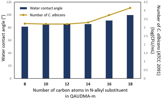 The antifungal effect against C. albicans was demonstrated by the reduction in the number of fungal colonies on copolymer surfaces, the occurrence of a growth inhibition zone, and the fungicidal effect of the 25 mg/mL copolymer suspensions. The antifungal effect depended on the Cm only from C14 to C18. It was revealed in correlations of a number of C. albicans colonies on copolymer surfaces with water contact angle (WCA) and fungal growth inhibition zone with a concentration of QA groups (xQA). The higher the WCA (lower surface hydrophilicity), the greater the number of C. albicans colonies on BG:QAm:TEG surfaces. The lower the xQA, the lower the inhibition zone diameter.