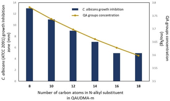 The results of the inhibition zone diameter were related to the concentration of QA groups (xQA) in the BG:QAm:TEG repeating units (Figure 11). As can be seen, the fungal growth inhibitory effects depend on the xQA. The lower its value, the lower the inhibition zone diameter. It can also be assumed that xQA of 3.63 mol/kg is the minimum below which no fungal growth inhibitory effect of the BG:QAm:TEG is observed.