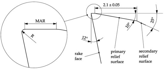 Selected dimensions of the cutter’s cross-section geometry, with designation of the variable values: R—radius of the rounded cutting edge and MAR—width of the cutter’s margin.