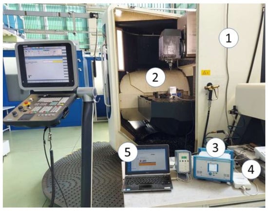 View of the test stand: (1) machine tool; (2) workspace with tool, dynamometer and sample; (3) charge amplifier; (4) A/C converter; and (5) computer.