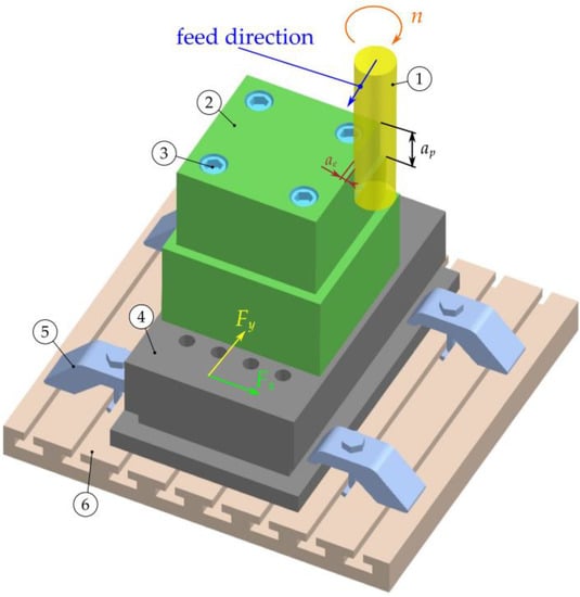 Diagram of the milling process: (1) tool; (2) workpiece; (3) clamping screws; (4) dynamometer; (5) clamping clamps; and (6) machine table.