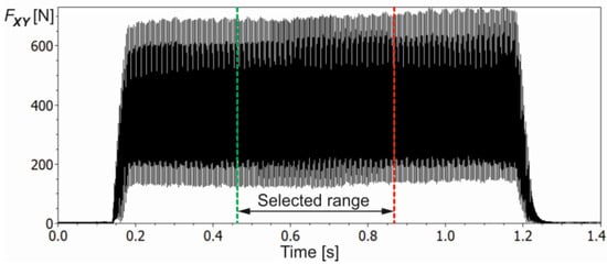 The course of the resultant cutting-force component FXY along with the selected time-series interval intended for analysis (without low-pass filter).