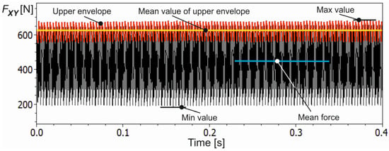 The dominant frequency component of about 1800 Hz is well visible. Furthermore, the frequency of force changes corresponding to successive material removal by cutter flutes was 900 Hz (three flutes, n = 18,000 rpm). Therefore, to remove dynamic force components, corresponding to vibrations of the tool-holder system, a low-pass filter with a cutoff frequency of 1150 Hz was applied. Then, to characterise the cutting process, the mean force value MeanF and the mean value of the upper force envelope composed of the local force peaks value MeanUpF, corresponding to the successive cutter teeth, were calculated. In addition, the maximum MaxF, minimum MinF and dispersion DispF values of the resultant cutting force were determined. The course of the selected range of the resulting cutting force FXY from Figure 4 together with the descriptive parameters mentioned is shown in Figure 6.