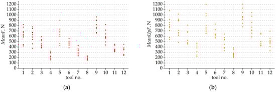 Technological tests were performed for 12 tools. For each tool, 13 cutting tests were performed. In each test, the components of the cutting force were measured, and the value of the resulting force Fxy was determined. A total of 156 cutting tests were carried out. Then, the values of the statistical parameters of the resulting cutting forces were determined. The results are shown in the graphs presented in Figure 6. Individual points over the tool number represent values obtained in nine tests carried out with different cutting parameters.