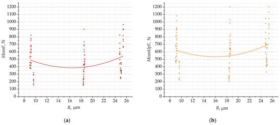 Cutting-force parameters in the function of radius R: (a) mean value of cutting force; and (b) mean value of the maxima.