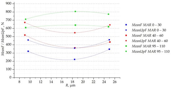 To more precisely analyse the influence of the radius R of cutting edge rounding on the cutting-force parameters, the results are presented for selected technological parameters and different values of R and MAR. Figure 9 compares the values of MeanF and MeanUpF. Analysing the presented results, it can be seen that the trend of change in the MeanF and MeanUpF values is the same in each case. Only the force values are different. In addition, it can be concluded from the presented results that the relationship of the cutting force with the rounding radius R is different for different values of the MAR. In contrast to the general trend shown in Figure 8, for large values of the margin width, the influence of radius R on the cutting force is reversed. A value of radius R of around 19 micrometres in most cases results in a minimisation of the cutting force. For the largest margin width and average radius of the rounded cutting-edge values, the force values are the largest. Additionally, for the largest MAR values, the influence of radius R on cutting force is not significant.
