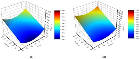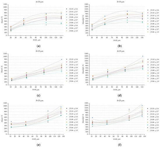 Mean value of maxima of cutting force in the function of R and MAR for: (a) the lowest cutting parameters, fz = 0.06 mm/tooth, ae = 0.4 mm; and (b) the highest cutting parameters, fz = 0.1 mm/tooth, ae = 1.0 mm.