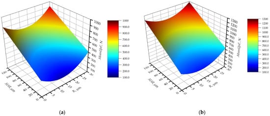 The graphs obtained from the MeanUpF function are very similar to those of the MeanF function, which confirms the previous observations. Both cutting-force parameters differ mainly in their values. The form of the model for both functions is the same. Linear factors dominate; in addition, there is one quadratic and one two-way factor. When comparing the graphs in Figure 11 and Figure 12, it can be seen that the response surfaces for the MeanUpF function have more curvature and are steeper. On the other hand, analysing Figure 11 and the results of the analysis of variance from Table 4, it can be deduced that the effect of MAR on MeanUpF is linear, and the effect of radius R is nonlinear and nonmonotonic. As with MeanF, for MeanUpF, the minimum of the function occurs for R ≈ 17 micrometres.